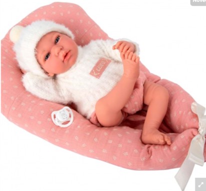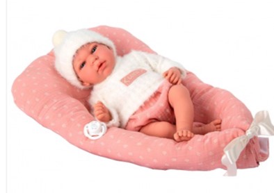 • Muñeco Elegance 40 cm ANDIE viene vestido con un conjunto de lana en tonos rosa y blanco, con gorrito y cojín a juego.
